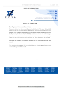 The Engineering Council of South Africa (ECSA) is a statutory body established in terms of the Engineering Profession Act (EPA), 46 of 2000. The Engineering Councils` primary role is the regulation of the engineering profession in terms of this Act. Its core functions are the accreditation of engineering programmes, registration of persons as candidates, professionals and professional specified categories, as well as the regulation of the practice of Registered Persons.